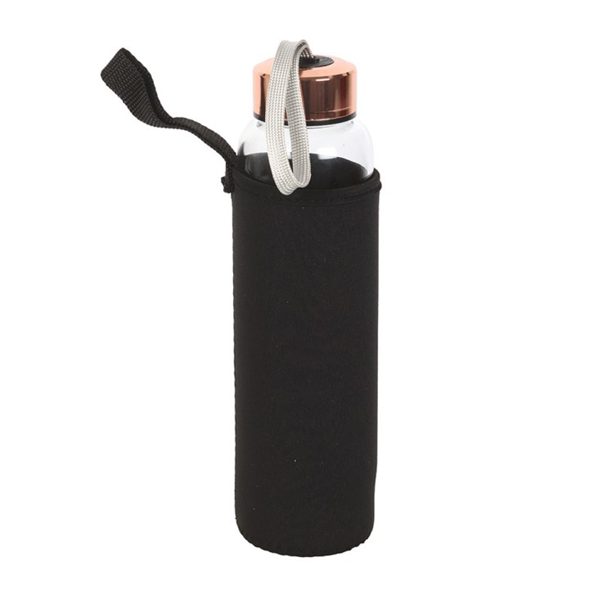Crafted from durable borosilicate glass, the bottle also includes a rubberised anti-slip bottom, a stainless steel lid with loop strap, and a protective neoprene sleeve for insulation and travel protection.