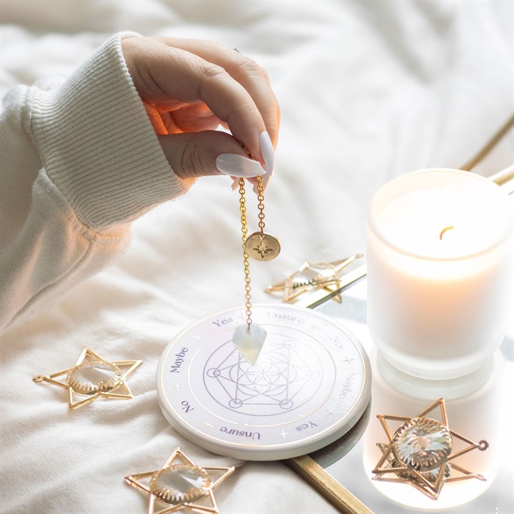 Pendulum divination is an ancient practice used in witchcraft, shamanism, and spiritual healing to access the subconscious mind, spirit guides, and universal wisdom. The opalite pendulum is known for its soft, ethereal glow and calming energy, making it especially powerful for uncovering truth, enhancing intuition, and easing emotional blockages. Paired with a ceramic Flower of Life divination board, this kit provides clear answers through Yes, No, Maybe, and Unsure markings — a complete set for beginners and experienced practitioners alike.