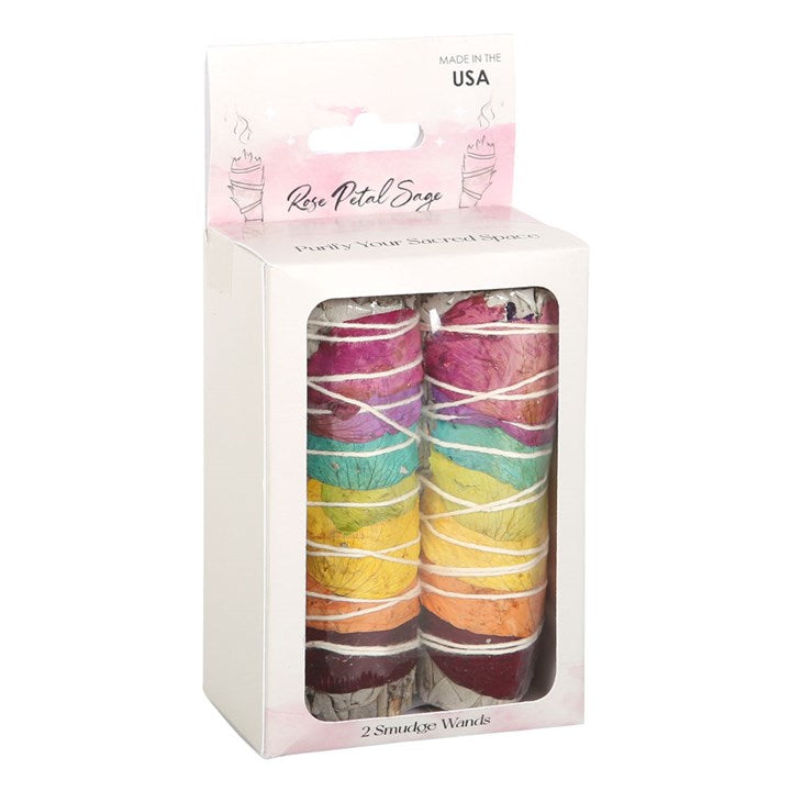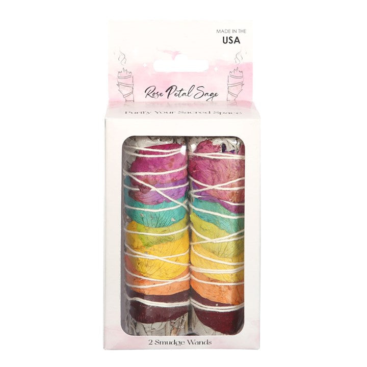 Bring beauty and balance to your rituals with this set of 2 white sage smudge sticks, accented by a rainbow of dried rose petals. Traditionally known as smudge wands, these bundles combine the purifying power of sage with the gentle, heart-opening energy of roses, creating a unique tool for both cleansing and healing.